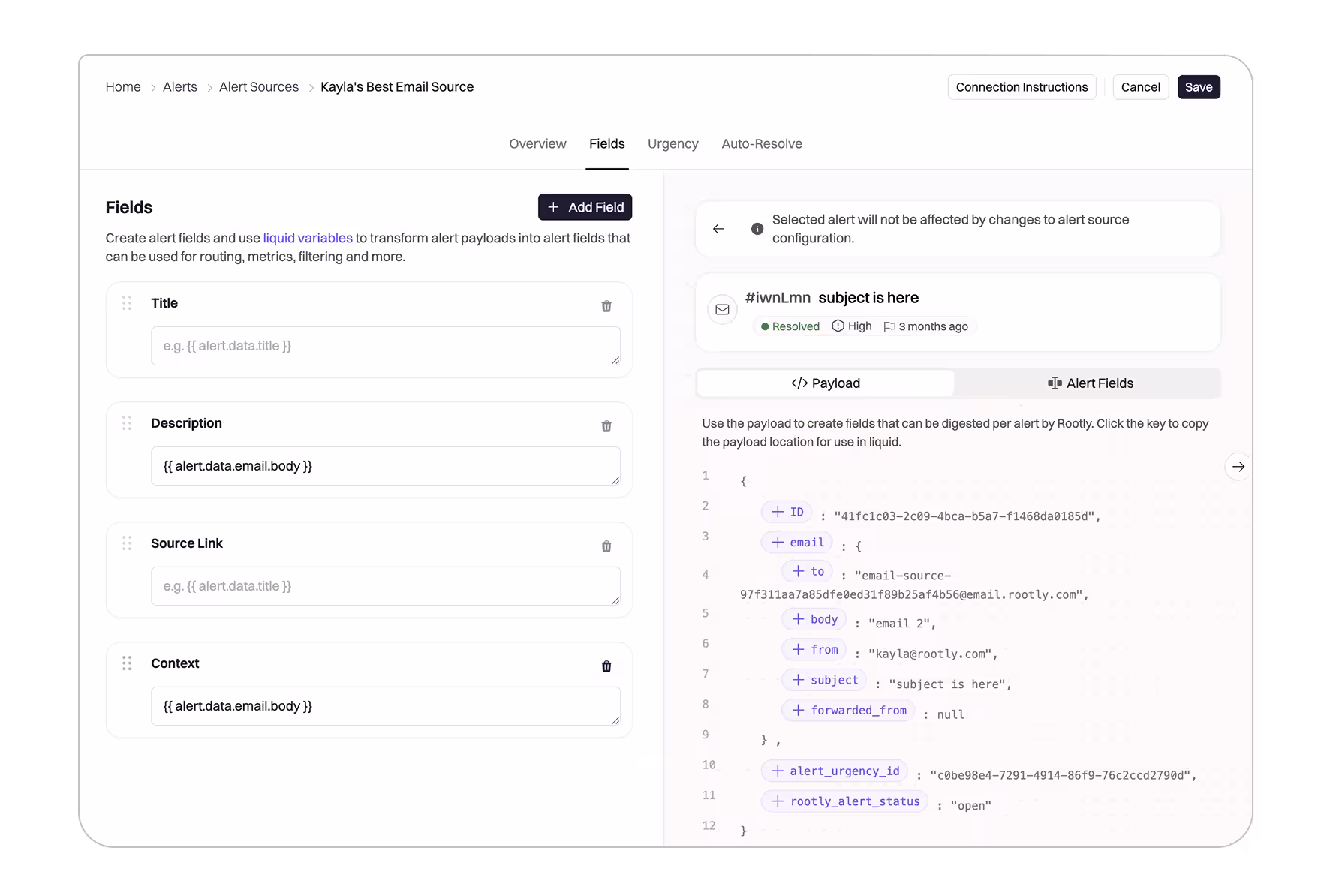 - Adding clarity and consistency: Transform unstructured payloads into standardized fields that can be used everywhere in Rootly—alerts, routing, analytics, and workflows.