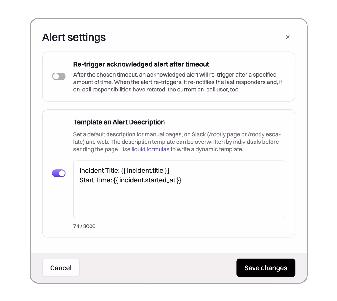 /rootly pageor/rootly escalate. - Dynamic and flexible: Use Liquid variables to dynamically include incident, service, environment, or other contextual data in each alert.