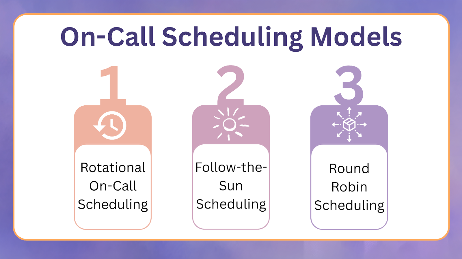 - Different scheduling models work for different team sizes and global distributions, including rotational shifts, follow-the-sun coverage, and Round Robin alert distribution. The best choice depends on alert volume, geographic spread, and service complexity.